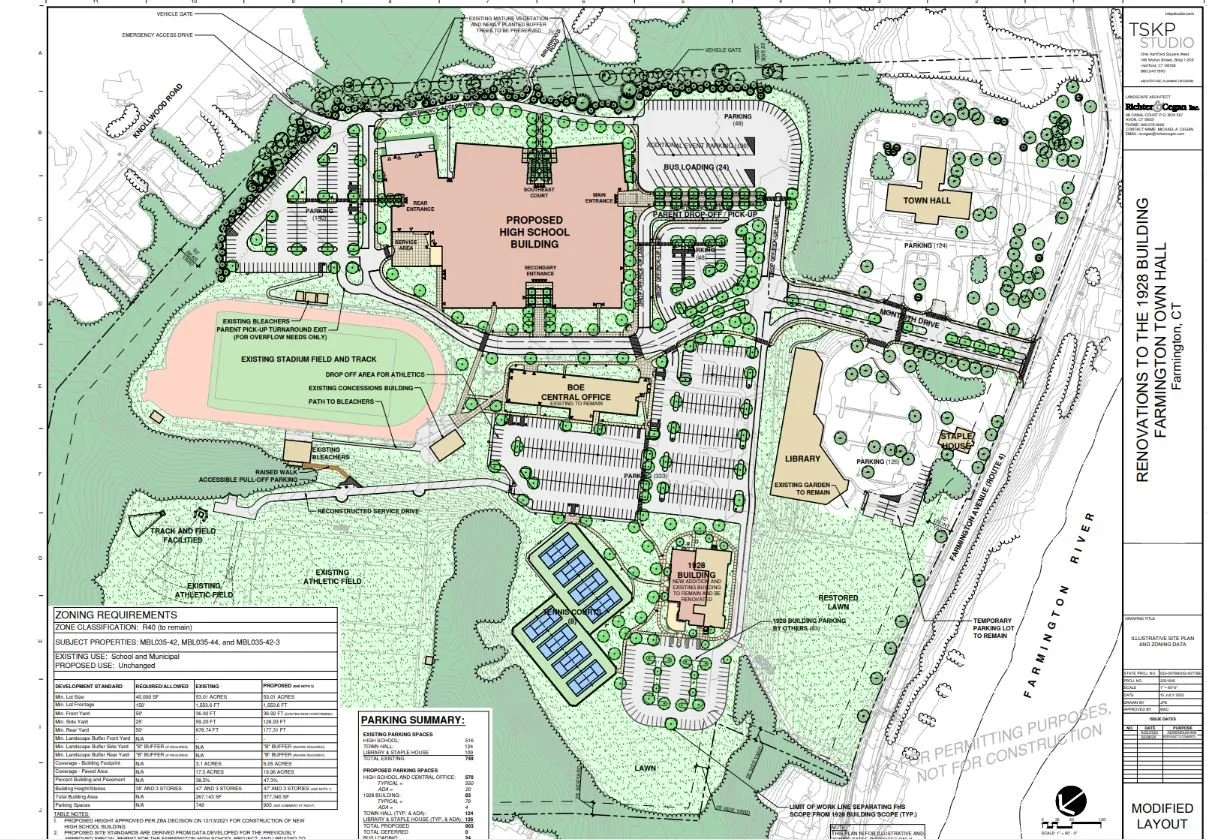 The site plan depicted below was approved by the Town Plan and Zoning Commission in March 2024. This plan includes the renovation of the 1928 building and associated sitework for the new Town Hall, as well as the relocation of the tennis courts. For more information on the 1928 project, please visit www.1928building.org.